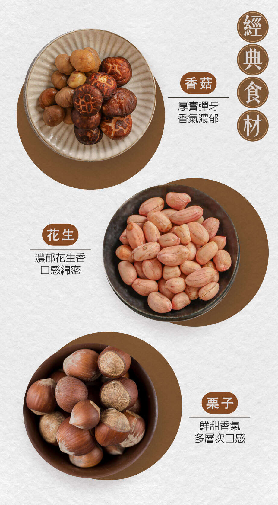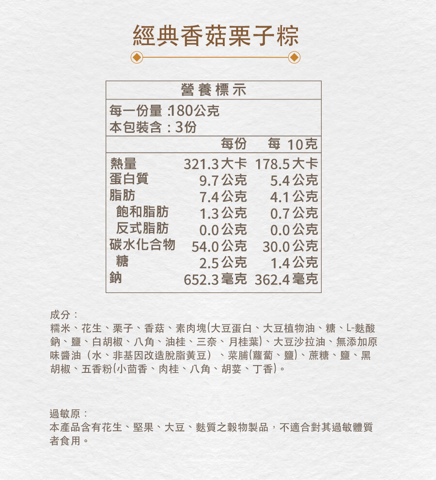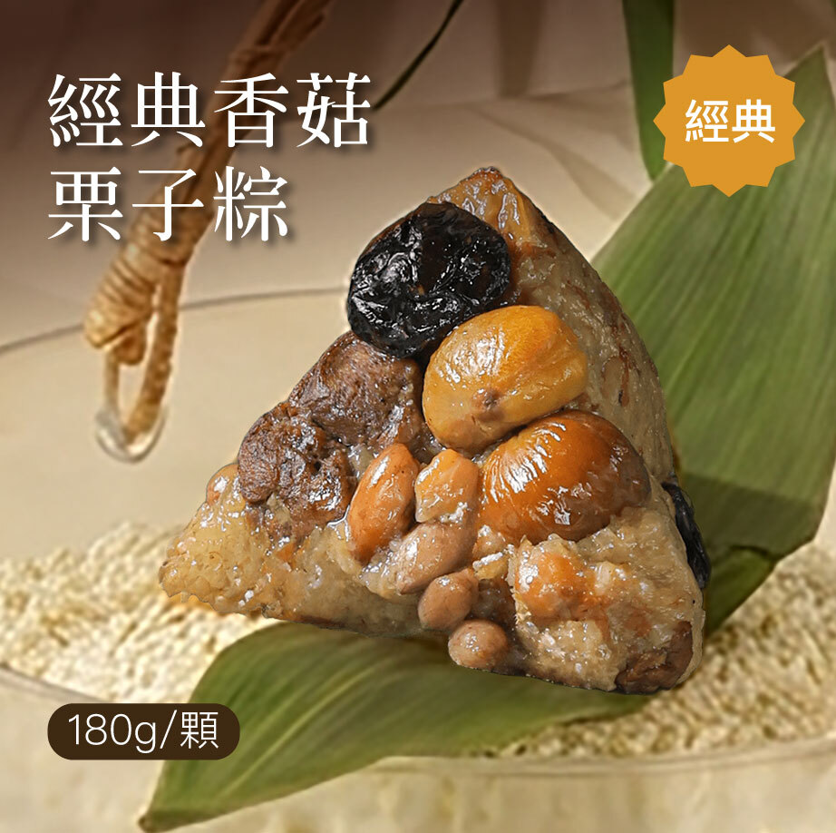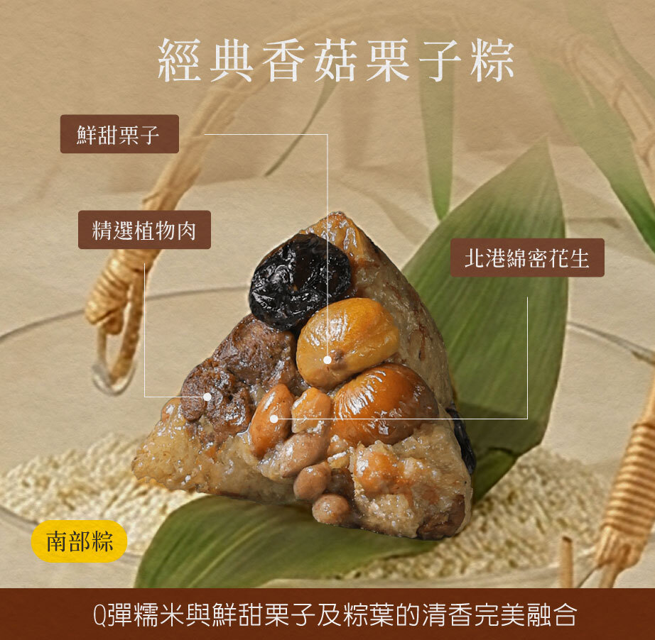 嚴選在地食材,北港綿密花生、埔里碩大香菇及鮮甜栗子入粽,Q彈糯米與鮮甜栗子及粽葉的清香完美融合。