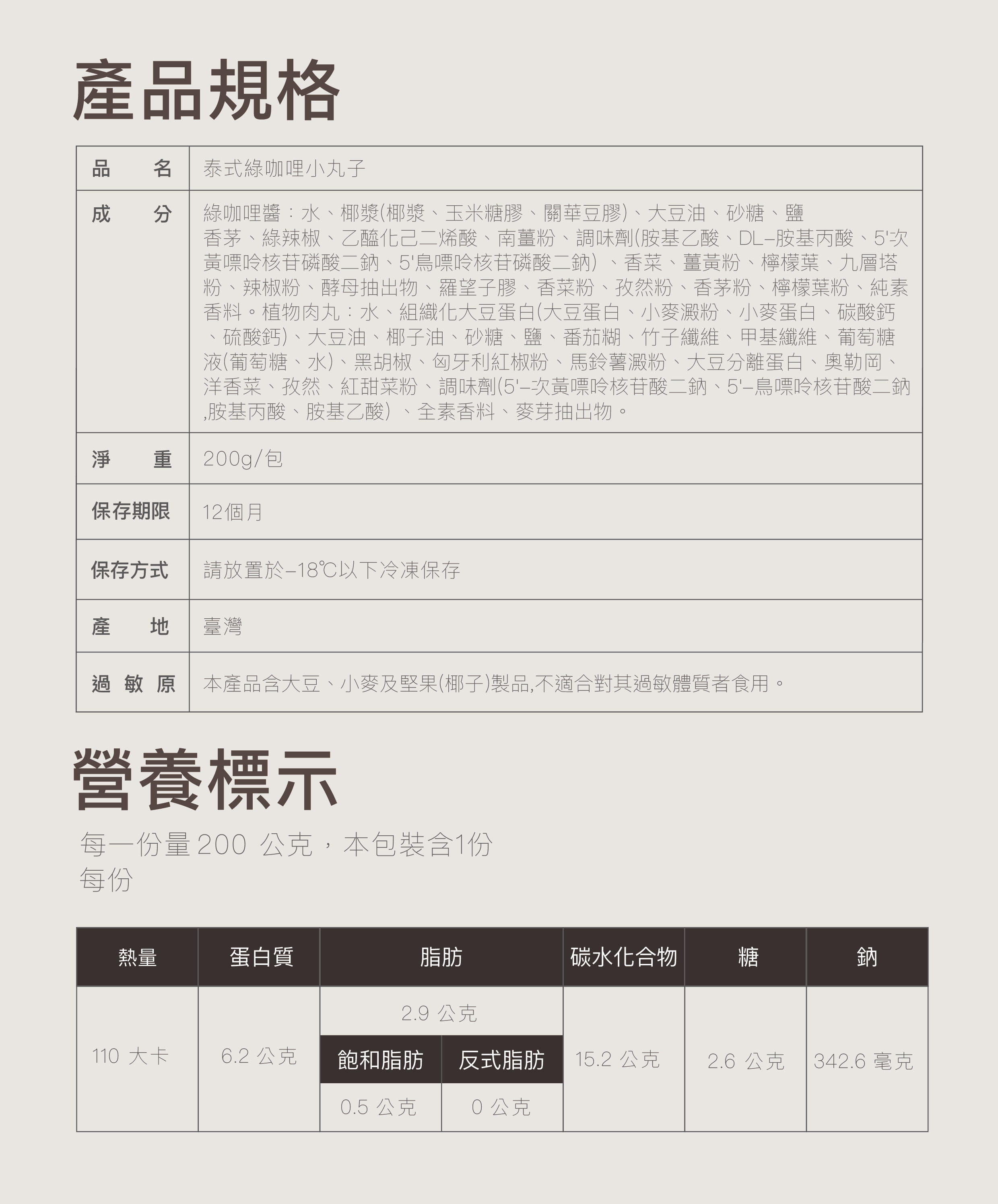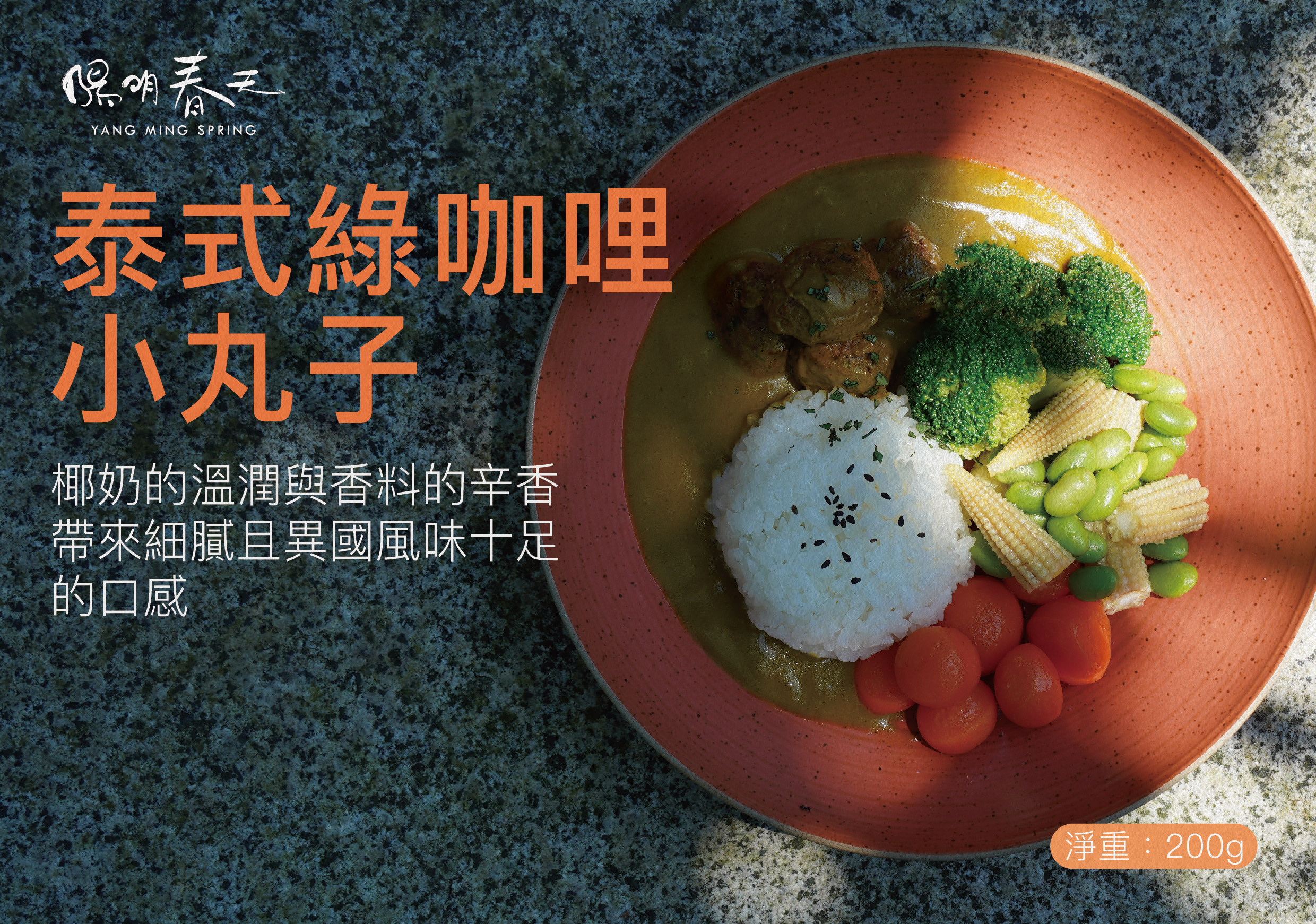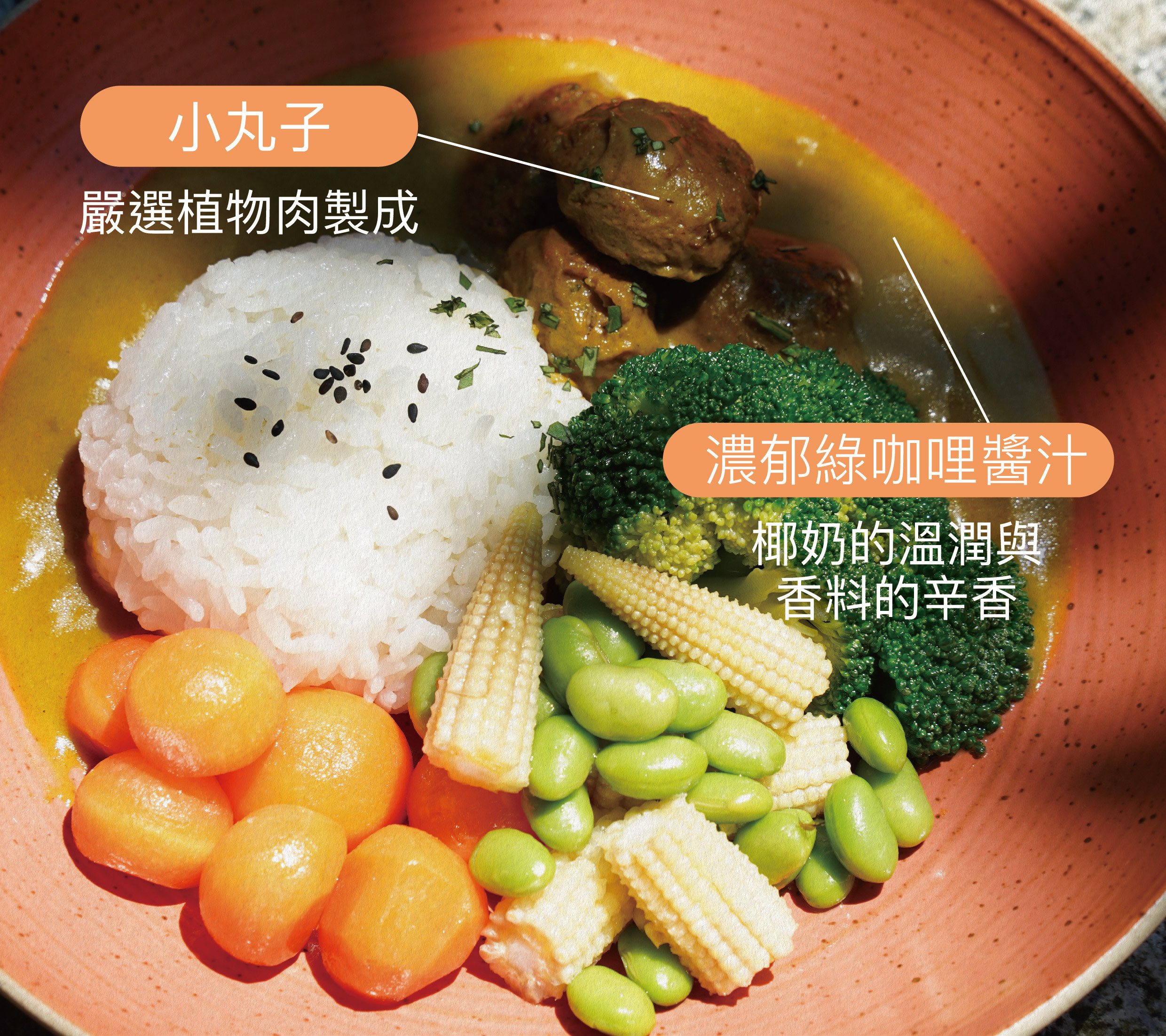 嚴選植物肉製成的小丸子,吸附濃郁的泰式綠咖哩醬汁